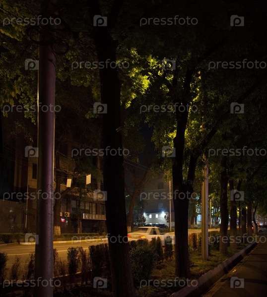 Бишкек, Киргизия. Подсвеченные светом ночных фонарей кроны дубов на одной из центральных улиц столицы