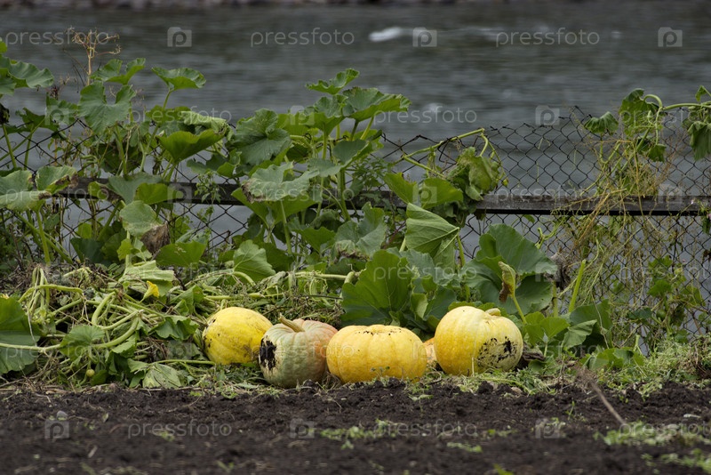 Россия. Юг Западной Сибири, горный Алтай. Огромные тыквы в огороде поселка Кебезень на берегу реки Бия