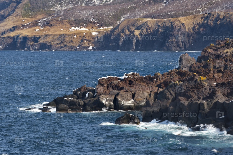 Россия. Дальний Восток, Курильские острова. Очень твердые и острые базальтовые скалы вдоль побережья Охотского моря на острове Итуруп