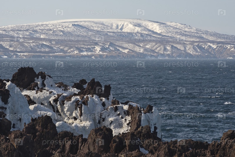 Россия. Дальний Восток, Курильские острова. Очень твердые и острые базальтовые скалы вдоль побережья Охотского моря на острове Итуруп