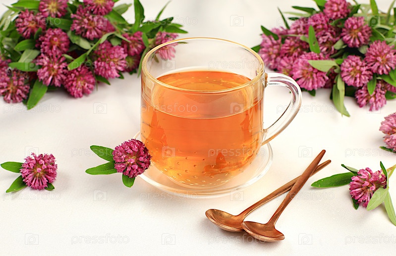 Лекарственный травяной чай или настой красного клевера в стеклянной чашке с цветами, концепция альтернативной традиционной медицины, источник эстрогена, средство от менопаузы, реклама зеленой аптеки,