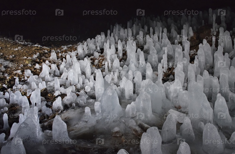 Россия. Курильские острова. Пещера с многочисленными ледяными сталагмитами на острове Итуруп. Во времена владения островами Японией до 1945 года в этих пещерах располагался военный госпиталь