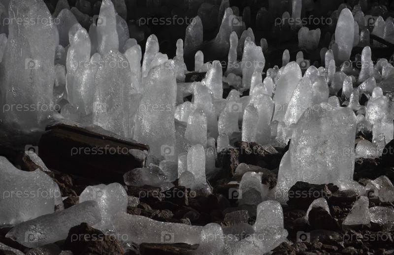Россия. Курильские острова. Пещера с многочисленными ледяными сталагмитами на острове Итуруп. Во времена владения островами Японией до 1945 года в этих пещерах располагался военный госпиталь