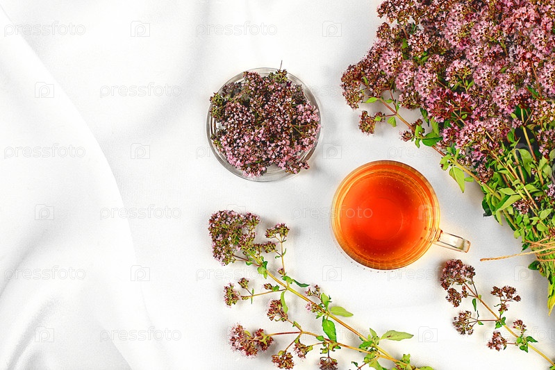 Лекарственный травяной чай или настой орегано в стеклянной чашке с цветами, концепция альтернативной традиционной медицины, реклама зеленой аптеки, сбор полезных трав для лечения по народным рецептам,