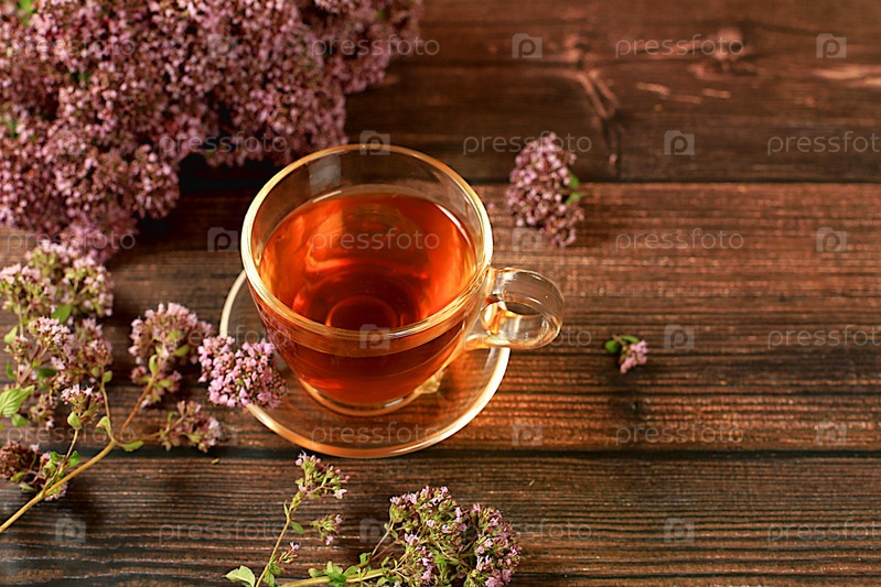 Лечебный травяной чай или настой орегано в стеклянной чашке с цветами, концепция альтернативной традиционной медицины, реклама зеленой аптеки, сбор полезных трав для лечения по народным рецептам,