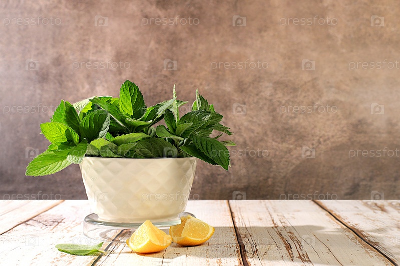 Цветочная композиция из диких лекарственных трав, мята в чашке с лимоном на деревянном столе, сбор полезных трав для лечения по народным рецептам, реклама зеленой аптеки,