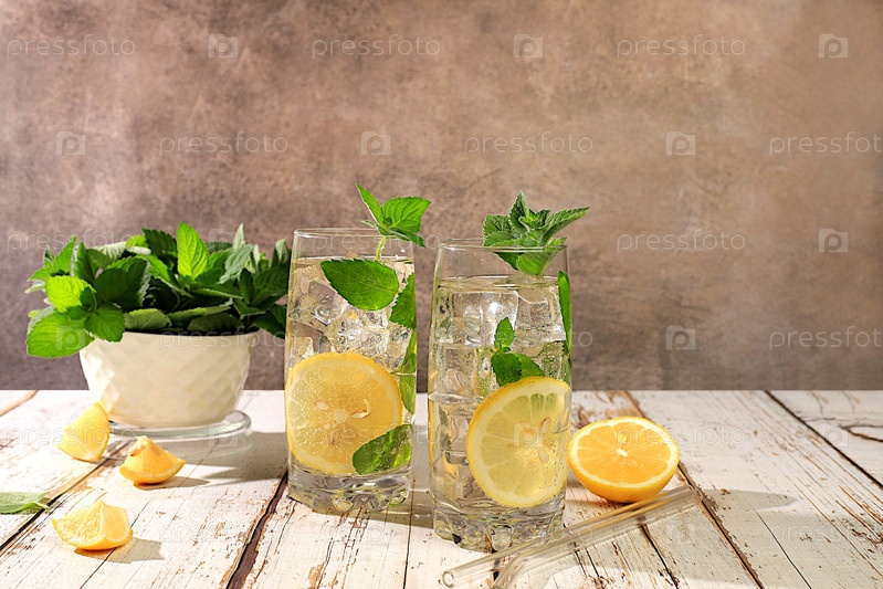 Лечебный травяной чай или настой мяты с лимоном и льдом, концепция детокс-диеты и альтернативной традиционной медицины, сбор полезных трав для лечения в соответствии с