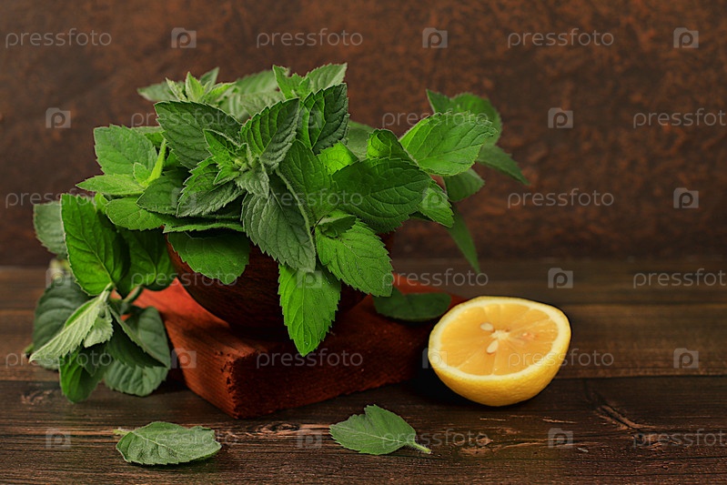 Цветочная композиция из диких лекарственных трав, мята в чашке с лимоном на деревянном столе, сбор полезных трав для лечения по народным рецептам, реклама зеленой аптеки,