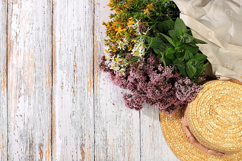Цветочная композиция из диких лекарственных трав на деревянном столе в холщовой экологически чистой сумке, букет зверобоя, орегано, мяты, ромашки, сбор полезных трав