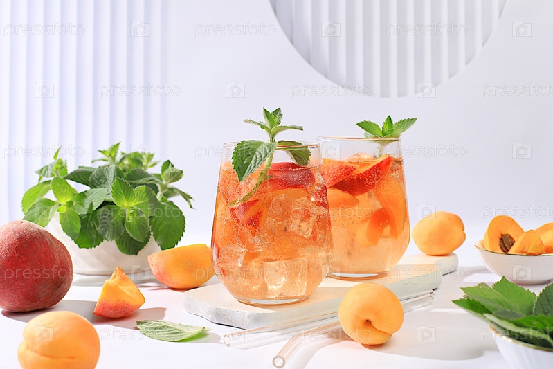 Ледяной персиковый чай или коктейль с мятой и абрикосами — рецепт освежающего летнего напитка. Два стакана с персиковым фруктовым лимонадом на светлом столе, детокс-диета и концепция похудания, меню для ресторана,