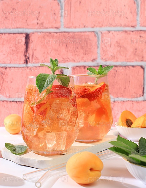 Ледяной персиковый чай или коктейль с мятой и абрикосами — рецепт освежающего летнего напитка. Два стакана с персиковым фруктовым лимонадом на светлом столе, детокс-диета и концепция похудания, меню для ресторана,