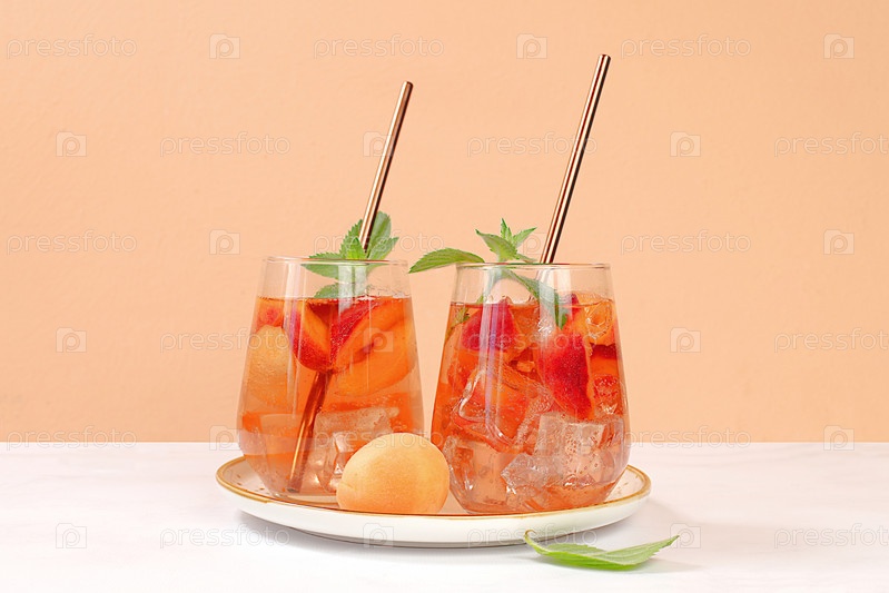 Ледяной персиковый чай или коктейль с мятой и абрикосами — рецепт освежающего летнего напитка. Два стакана с персиковым фруктовым лимонадом на светлом столе, детокс-диета и концепция похудания, меню для ресторана,