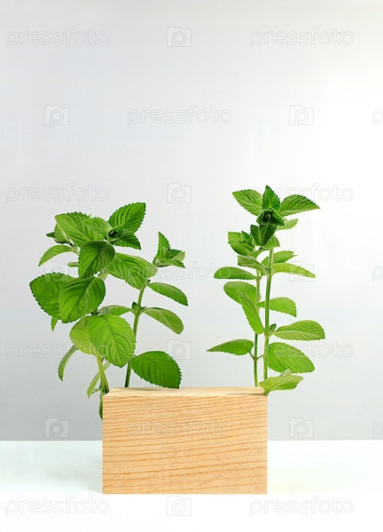 Абстрактный фон с натуральным деревянным подиумом и листьями мяты, пустая витрина для демонстрации или презентации косметических продуктов, минимальная эко-концепция, избирательный фокус