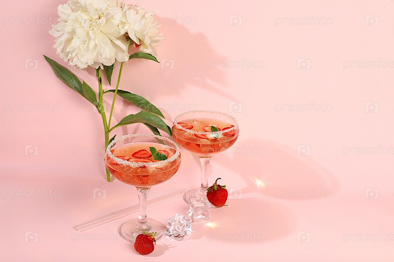 Современный натюрморт с розовым мартини, алкогольным коктейлем, клубникой и цветами пиона на элегантном современном фоне, минимальная концепция бара и праздничной вечеринки, кафе, рекламный баннер, выборочный фокус,