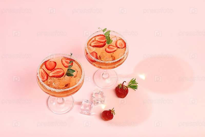 Современный натюрморт с розовым мартини, плоской планировкой, алкогольным коктейлем, клубникой на элегантном современном фоне с длинными тенями, минимальной концепцией для бара и праздничной вечеринки, кафе, рекламным баннером, избирательным фокусом,