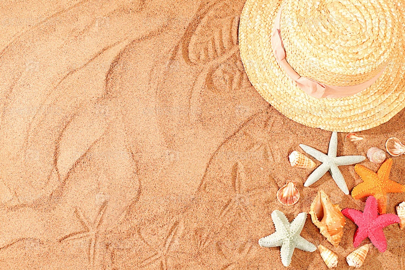 Экзотические ракушки, звезды и шляпа на песчаном солнечном пляже, природный фон и туристическая реклама, концепция летнего отдыха, солнечный баннер, место для текста, выборочный фокус