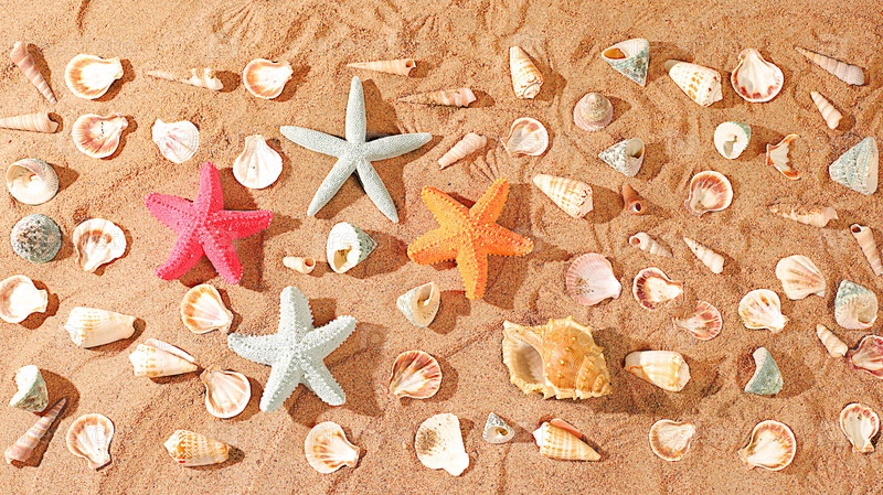 Экзотические ракушки и морские звезды на песчаном солнечном пляже, природный фон и туристическая реклама, концепция летнего отдыха, солнечный баннер, выборочный фокус
