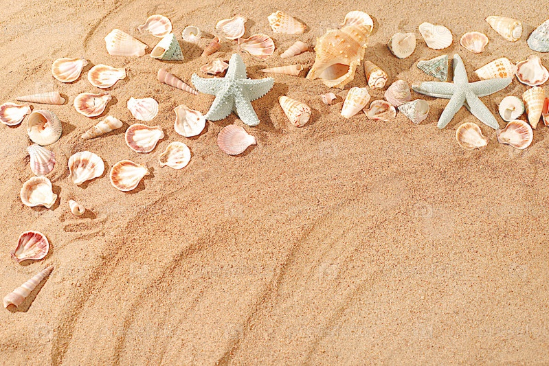 Экзотические ракушки и морские звезды на солнечном песчаном пляже, природный фон и туристическая реклама, концепция летнего отдыха, солнечный баннер, место для текста, выборочный фокус