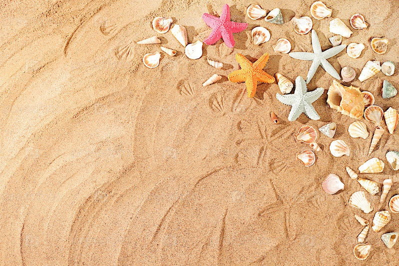 Экзотические ракушки и морские звезды на песчаном солнечном пляже, природный фон и туристическая реклама, концепция летнего отдыха, солнечный баннер, выборочный фокус