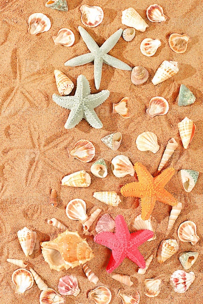 Экзотические ракушки и морские звезды на песчаном солнечном пляже, природный фон и туристическая реклама, концепция летнего отдыха, солнечный баннер, выборочный фокус