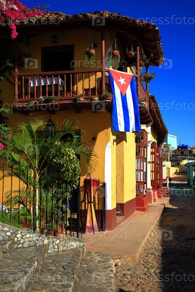 Желтое здание в колониальном стиле с кубинским флагом. Тринидад, Куба
