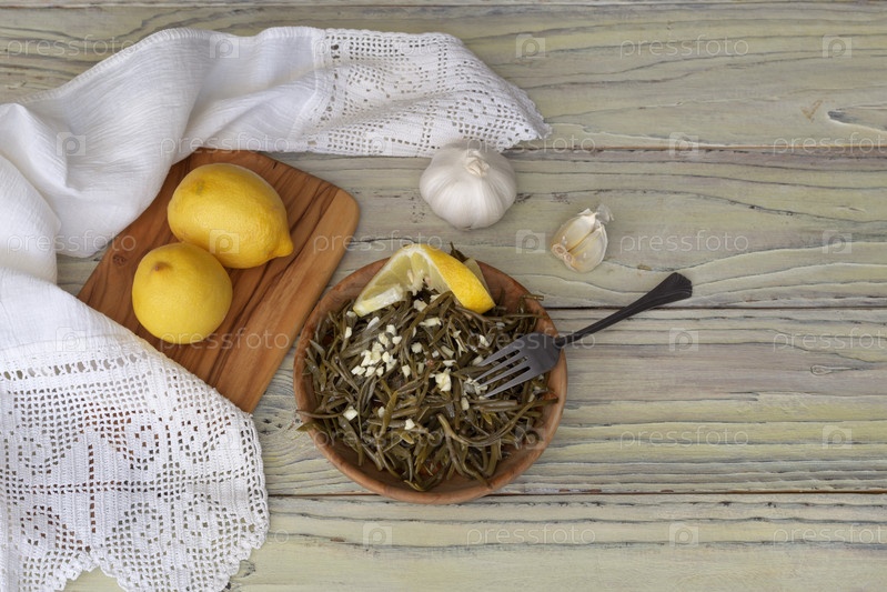 Маринованные побеги растений (Crithmum maritimum) на деревянном столе