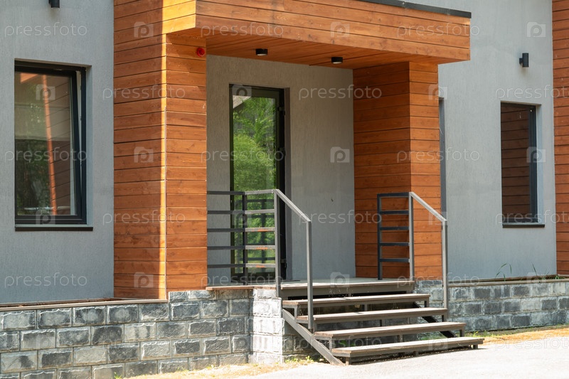 Внешний вид современного дома со стеклянной дверью, ступеньками и крыльцом с элегантными элементами дизайна