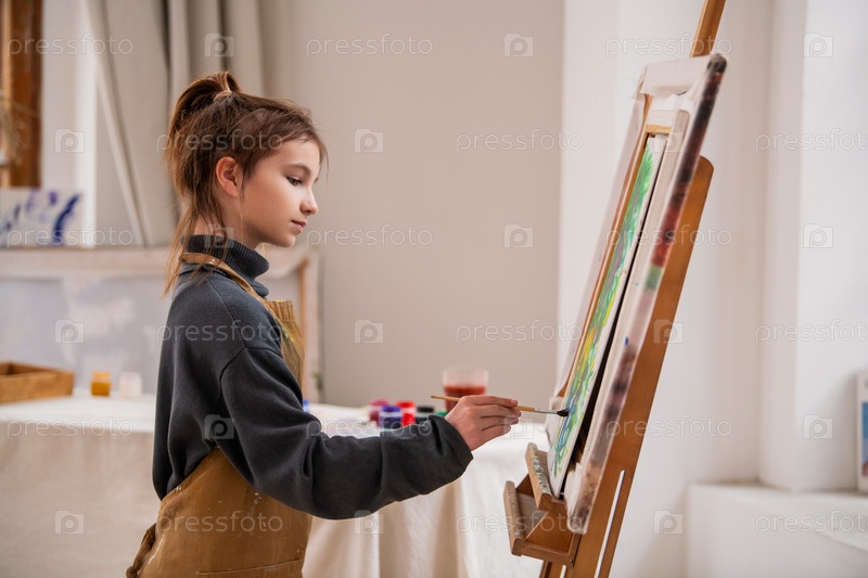 Девушка рисует картину на холсте. На ней фартук, в руке у нее кисть. Картина красочная и живая, с сочетанием зеленых и синих оттенков