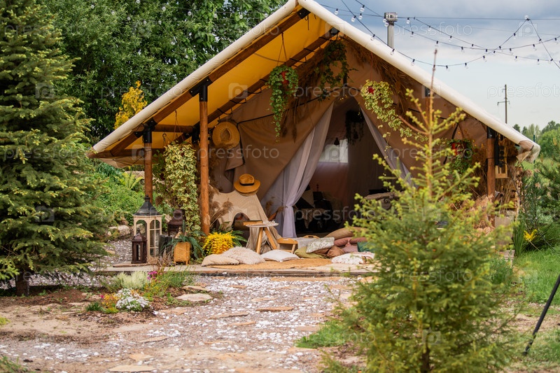 Большая удобная палатка в открытом лесу, на природе, летний поход, путешествие, приключенческий отдых