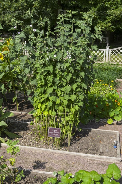 Цветящий лекарственный алтей (лат. Althaea officinalis) на колыбели с лечебными растениями в Аптекарском саду (филиал ботанического сада МГУ). Москва. июль, солнечный