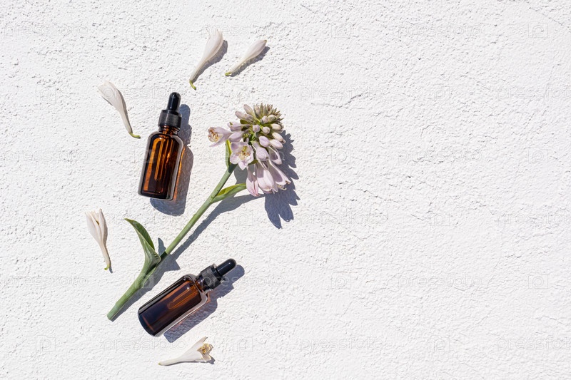 Два косметических флакона из темного стекла с капельницей с натуральным средством по уходу за лицом и телом. натуральная косметика. вид сверху. Копия пространства