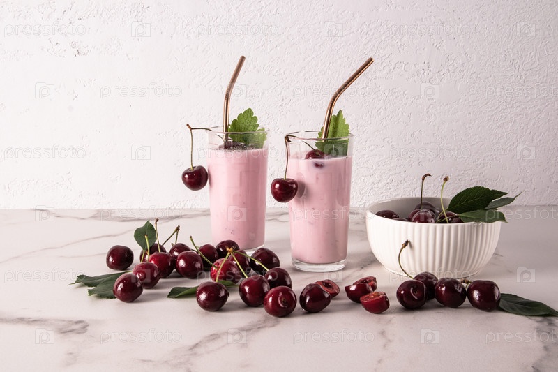 Два шикарных бокала с нежным охлажденным смузи или коктейлем с металлической трубочкой на мраморном столе среди многочисленных спелых вишен. Передний план