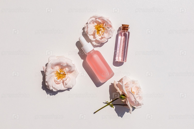 Матовый косметический флакон-капельница с натуральным розовым маслом и бутылкой розовой воды на белом рельефном фоне среди цветущих роз. Забота. красота