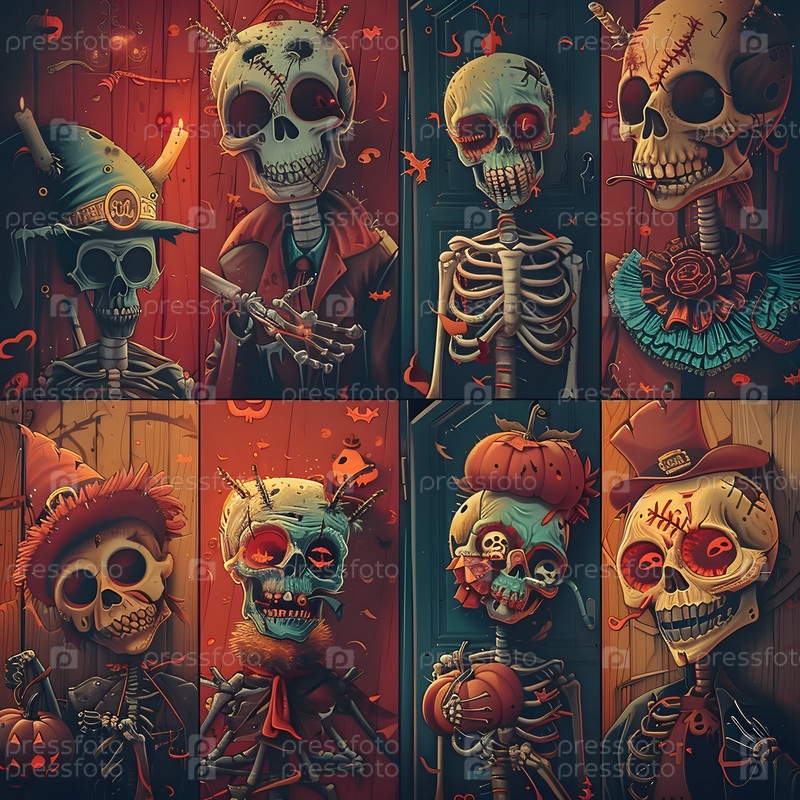 Очаровательный детский мультфильм, милые скелеты, черепа, кости, Хэллоуин, морда с лицами и подмигивающими глазами, пастельные яркие цвета, набор сбора, детская иллюстрация, обои