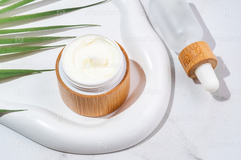 Открытая бамбуковая баночка с кремом и флакон-капельница с маслом для лица на мраморном фоне. Макеты косметических контейнеров. Фон для презентации брендинга и упаковки. Концепция натуральной косметики по уходу за кожей