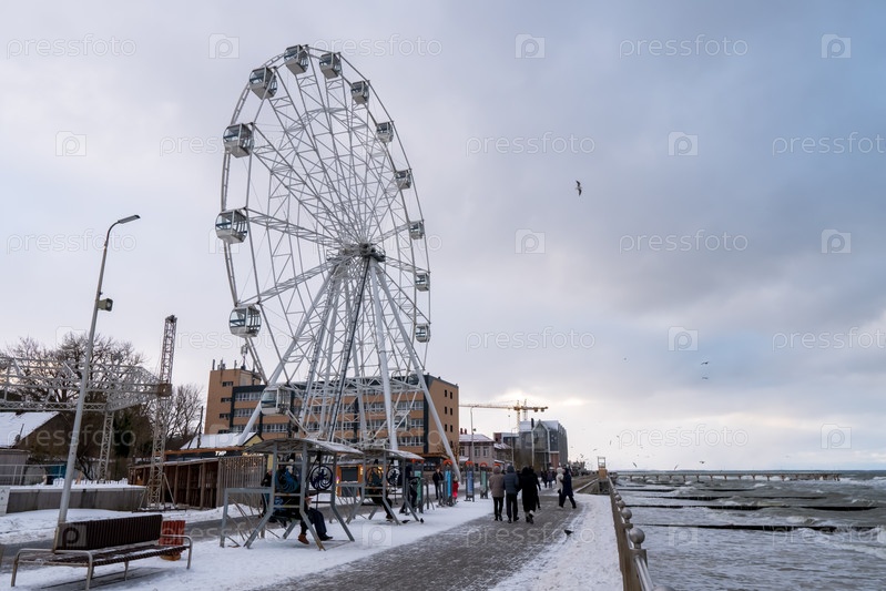 Зеленоградск, Калининград, Россия - 2024, 5 января: Пасмурная ветреная погода на морском курорте. Колесо обозрения на набережной