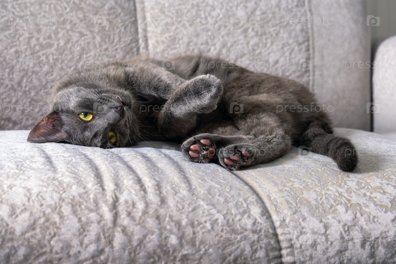 На диване лежит молодой темно-серый кот с желто-зелеными глазами. Селективный фокус