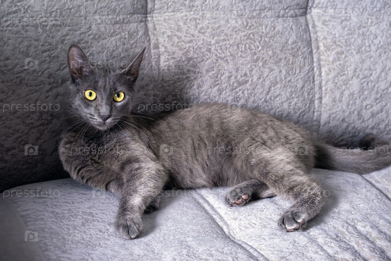 На диване лежит молодой темно-серый кот с желто-зелеными глазами. Селективный фокус