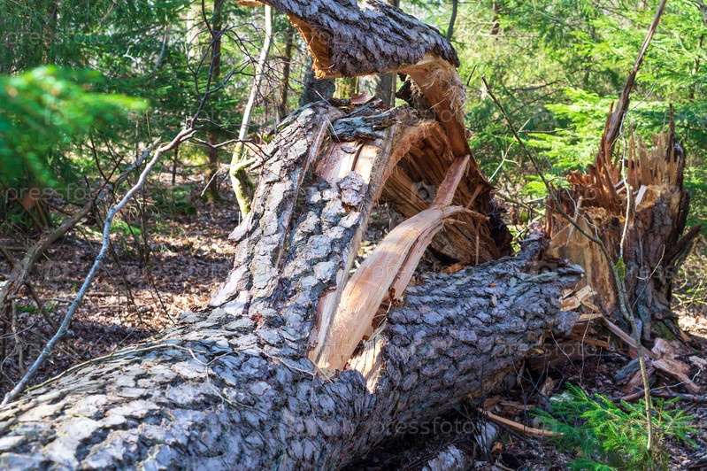 Старое дерево сломалось. Сломанные ветки в лесу. Осенний лес и сломанные деревья