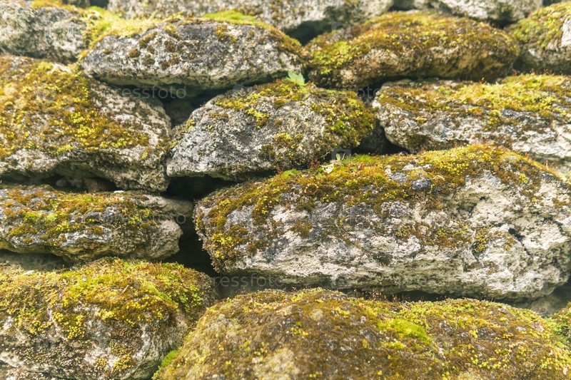 Каменная стена покрыта зеленым мхом и лишайником. Естественный фон