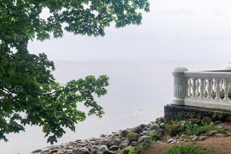 Старинная белая балюстрада на каменной стене на берегу моря