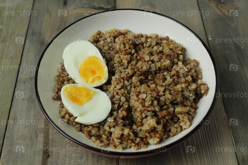 Гречневая каша с вареным яйцом, нарезанным в миску. Здоровая пища. Славянские традиции блюда