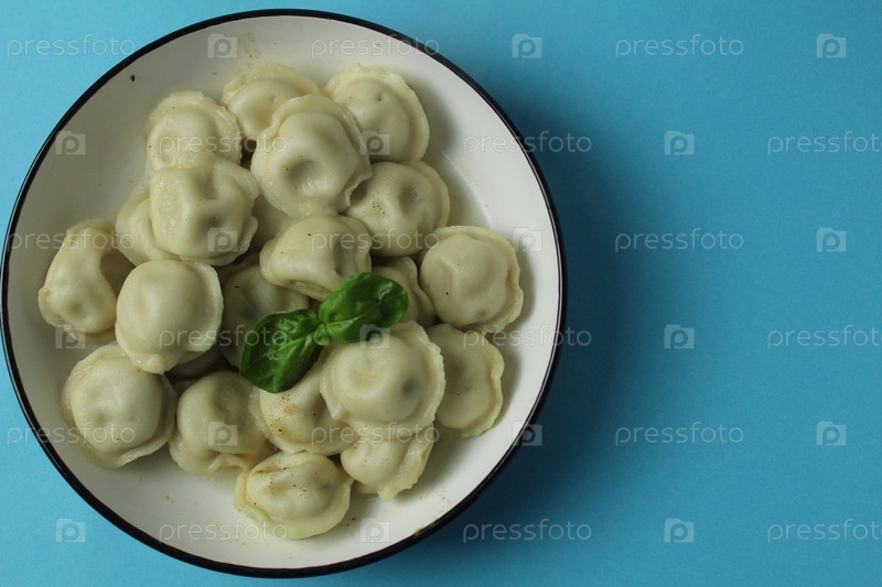 Пельмени в тарелке с зеленью базилика на синем фоне с местом для текста. Понятие славянской кухни