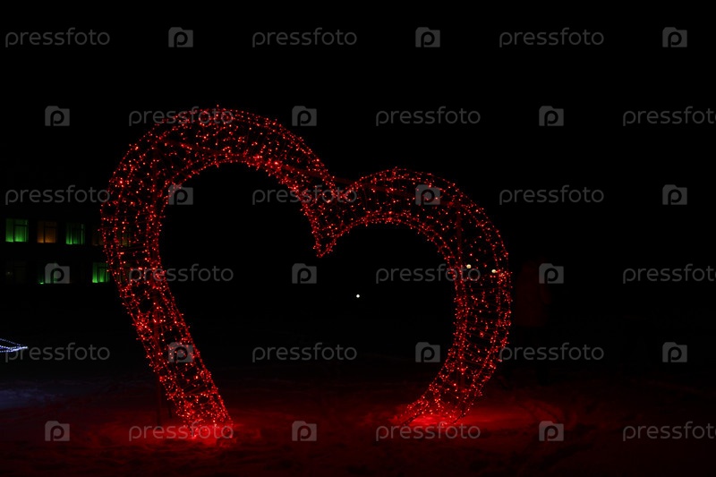 Рождественская подсветка фигуры Красное сердце ночью. Праздничная атмосфера, неоновая фотозона