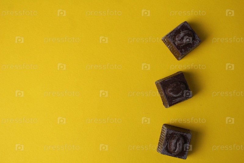 Шоколадные конфеты лежат в ряд, вид сверху на желтом фоне с местом для копирования текста