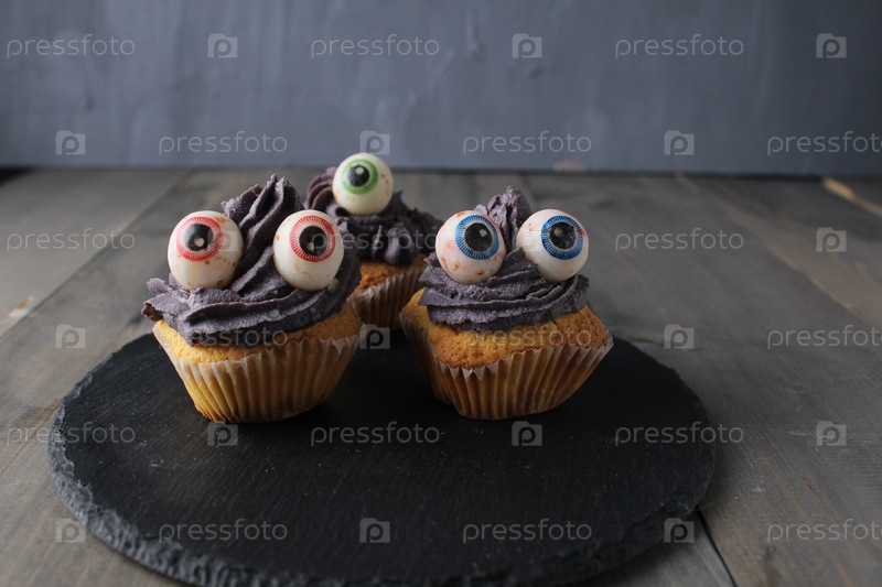 Три кекса с глазами на черной подставке к празднику. Подготовка к Хэллоуину. Страшная и забавная еда