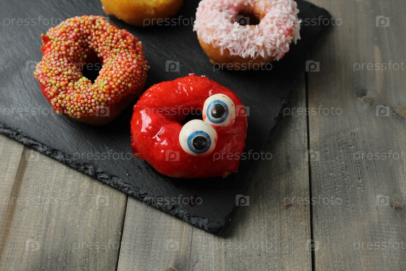 Пожертвуйте десерт со смешными глазами на сером фоне с местом для текста. Концепция празднования Хэллоуина