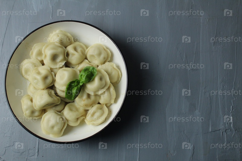 Пельмени готовы в миске, вид сверху с листом базилика на сером фоне с местом для текста рецепта. Понятие быстрого питания национальной кухни