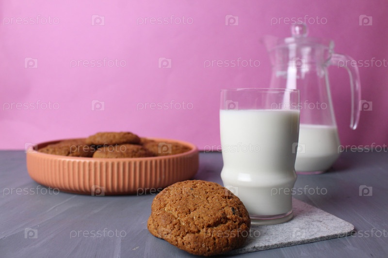 Концепция здорового завтрака: печенье с молоком в стеклянном кувшине на розовом фоне. Здоровое питание для детей