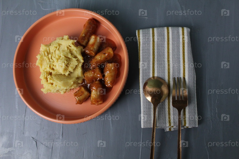 Подача ужина: картофельное пюре и сосиски в соусе в красивой тарелке с ложкой, вилкой, салфеткой на сером фоне, вид сверху